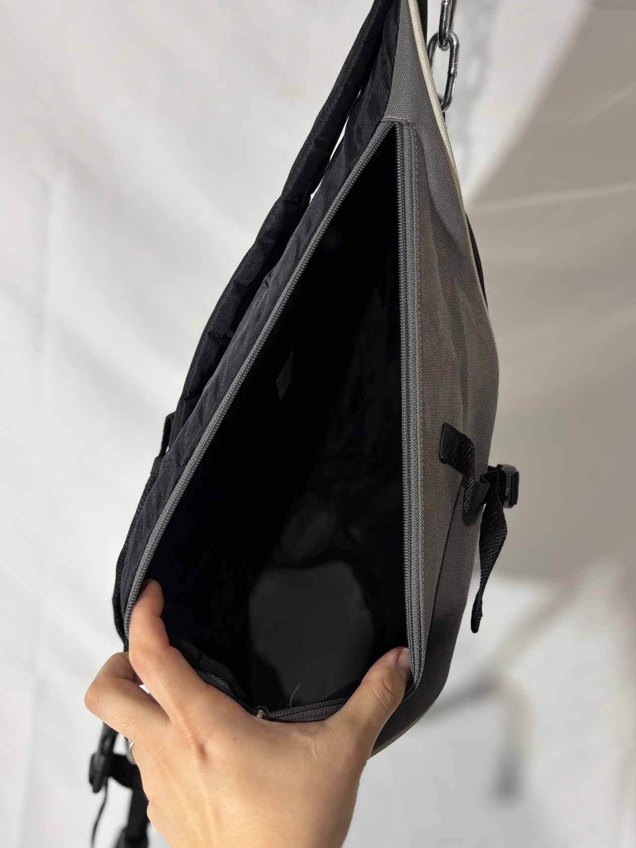 ナイロン素材のタフさと、ミニマルながらギミックの効いたディテールが◎。
