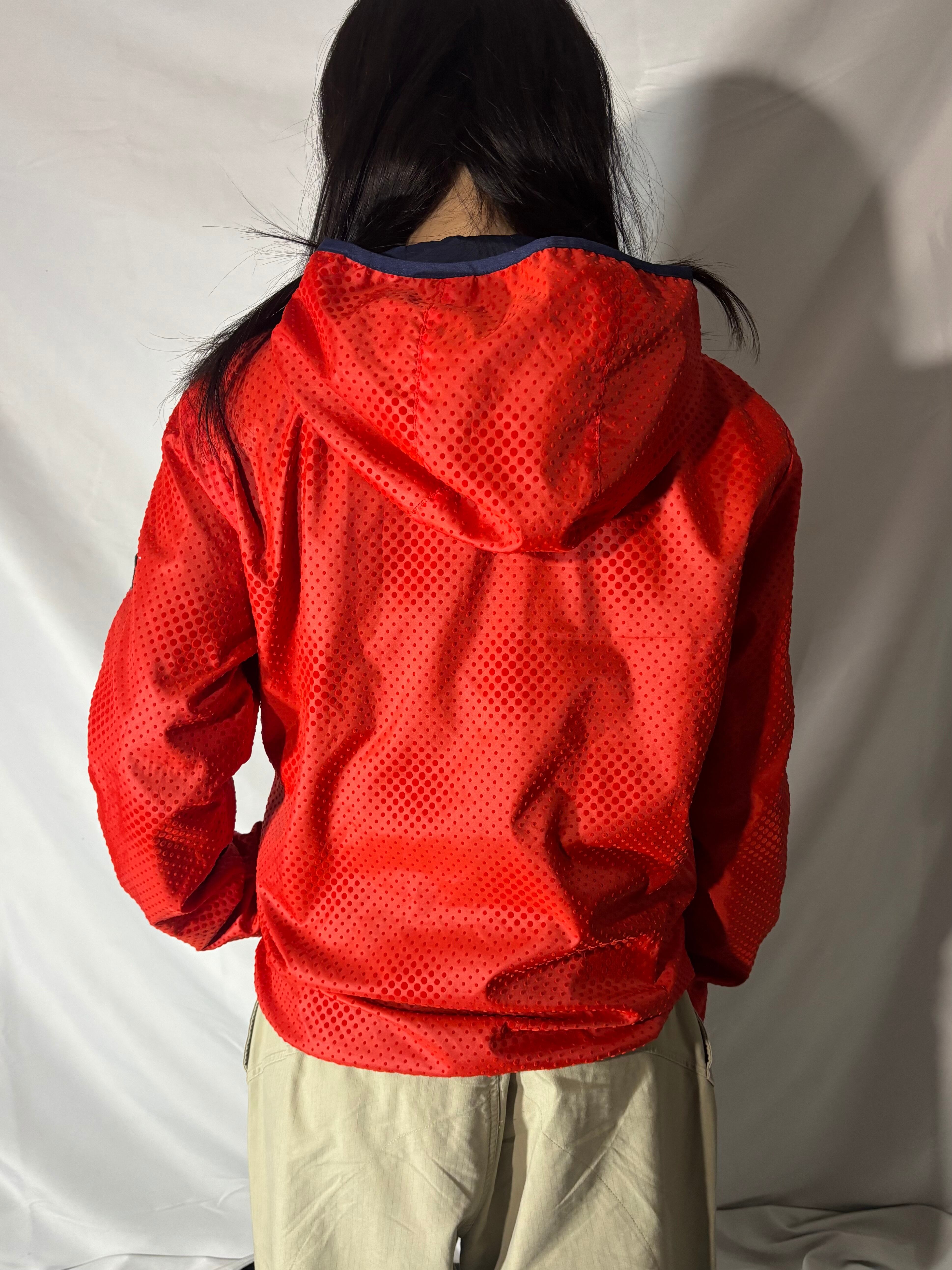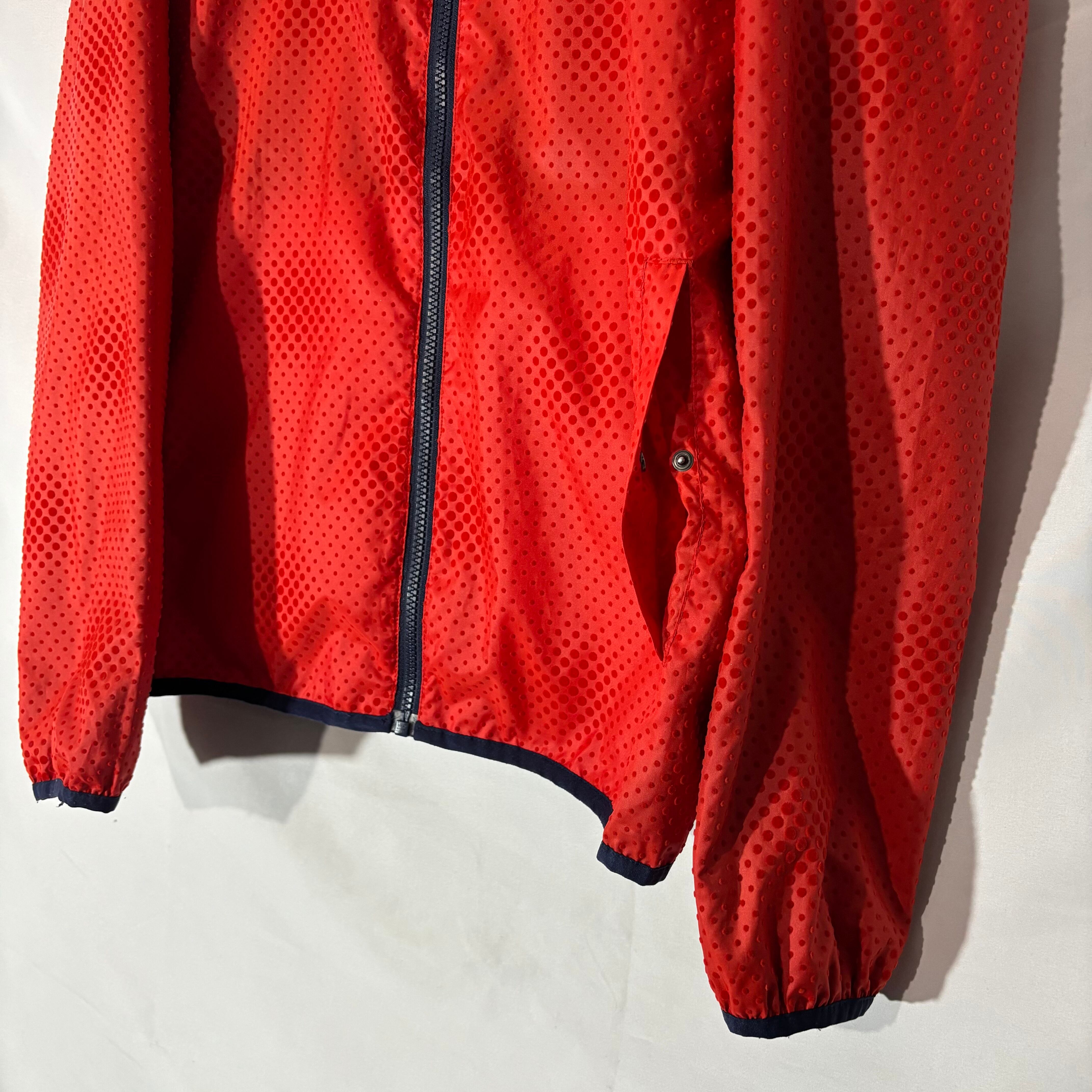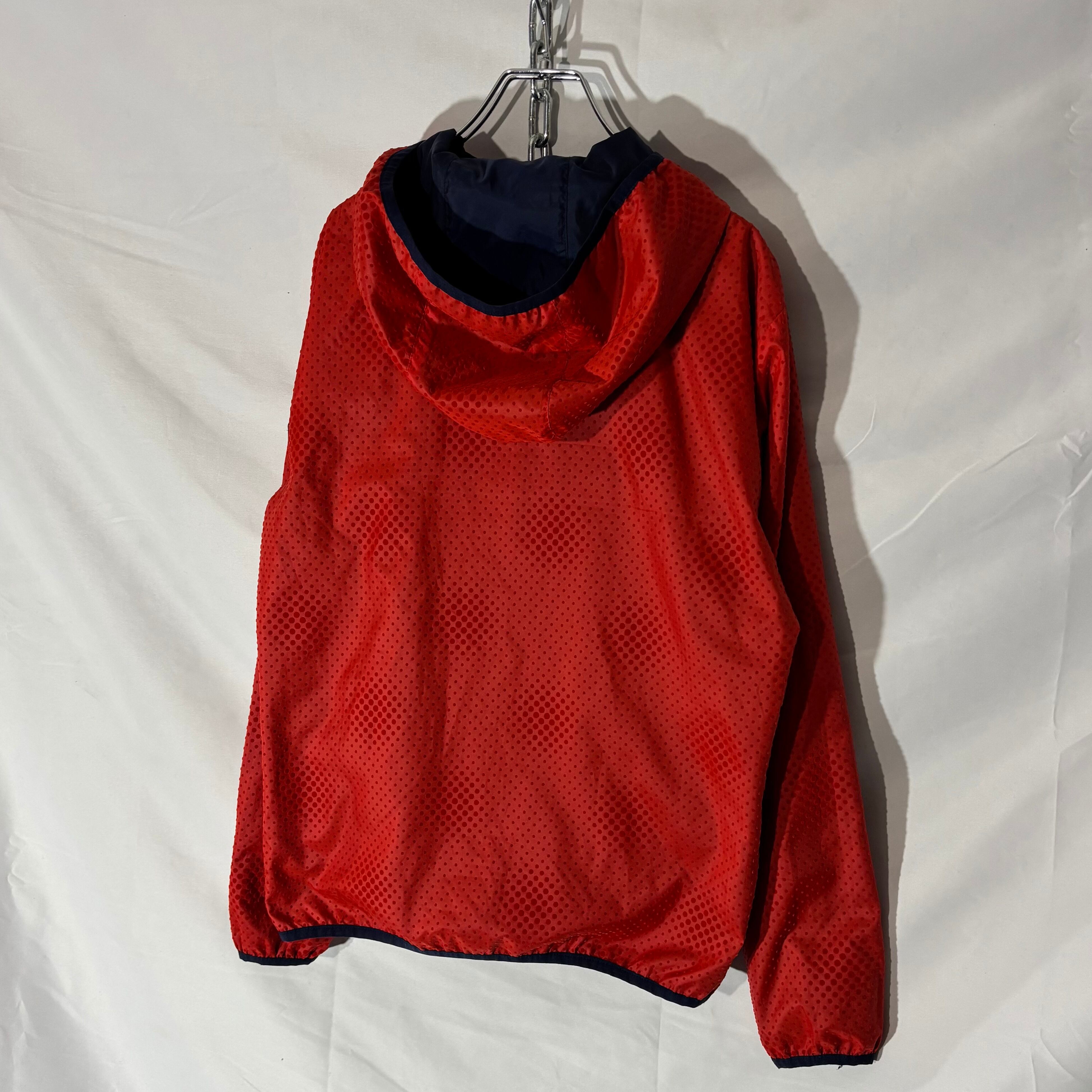 表面は凹凸のあるレッドボディでデザイン性のある1着。裏返すと落ち着いたネイビーに切り替わる2WAY仕様。シンプルなスタイリングに一枚差すだけで印象が変わるアイテム。
